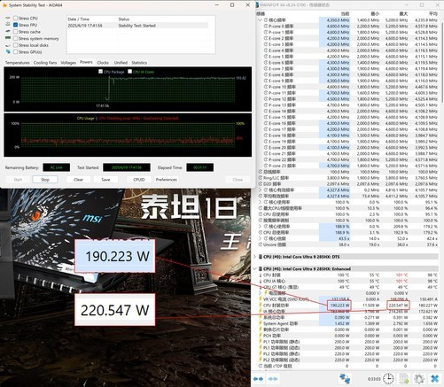 最后看一下功耗表现。压力测试30分钟,英特尔酷睿Ultra9285HX的功耗能够稳定在190W,过程中最大功耗甚至能够去到220W,非常夸张。从这一点其实可以看出,只要游戏本的散热足够给力,英特尔酷睿Ultra9285HX的性能还是有小幅提升的空间。