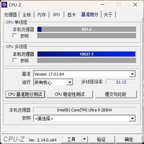 下面开始理论性能测试。首先是CPU-Z,在其基准跑分测试中,英特尔酷睿Ultra9285HX的单核成绩为881.5,多核成绩为18627.1,表现非常给力。单核成绩不俗,多核成绩同样也很高。即使没有超线程的加持,英特尔酷睿Ultra9285HX的多核成绩也是目前移动平台的顶级水平了。