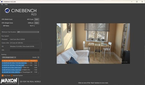 接下来是CinebenchR23,实测多核成绩直接突破40000分大关,来到40113pts,十分给力,单核成绩也很高,来到了2208pts。从这项测试能够看出,英特尔酷睿Ultra9285HX的优势就是有着优秀的单核性能,从而进一步提高多核性能。