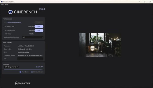 接下来是Cinebench2024,实测多核成绩能够达到2323pts,单核成绩达到134pts。Cinebench2024与R23区别比较大,其负载时间更长。2323pts的多核成绩,基本也说明了其旗舰级移动处理器的定位。