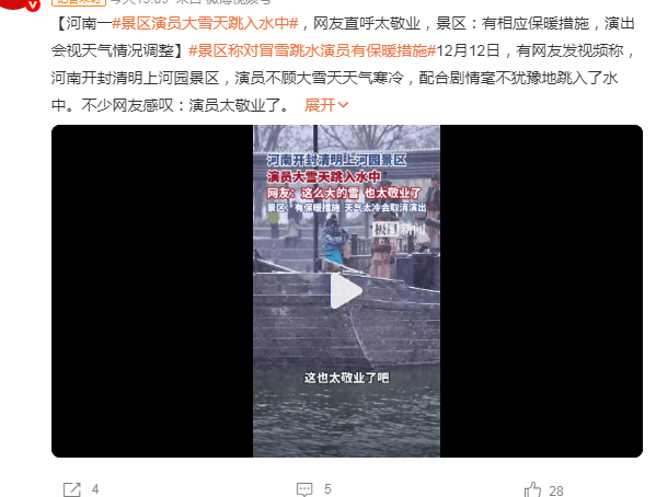 多数网友赞叹演员敬业精神,称“大雪天跳水震撼人心”,相关视频获河南省文旅厅账号发布,4小时内点赞超11万。游客表示“全情投入的表演让历史鲜活”,认为演员付出提升体验价值。